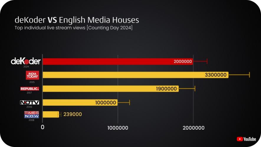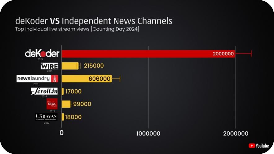 In May 2024, despite its recent launch, deKoder's YouTube Channel outperformed all independent English media channels. Moreover, during Results Day, it secured the position as India's second most viewed individual live stream, contending with prominent channels such as Republic, NDTV, and India Today.