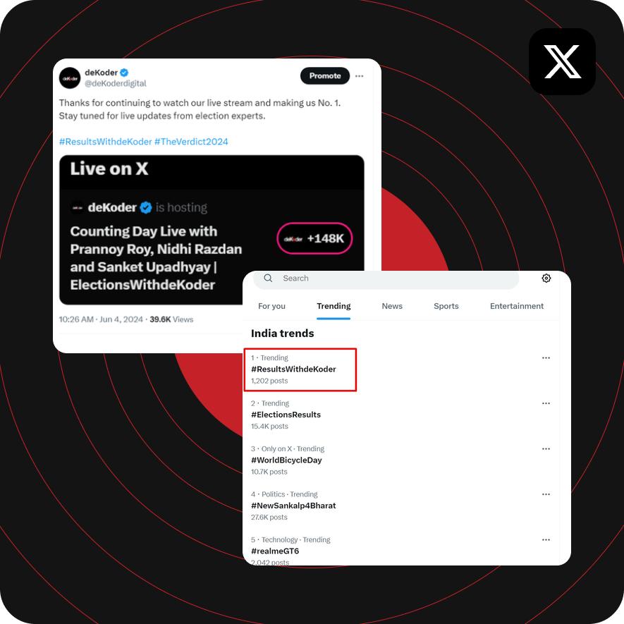 deKoder's X live stream on Twitter emerged as the leading English election results coverage live stream in India on June 4, 2024. Moreover, our stream achieved the top trending position on Twitter, accompanied by the hashtag #ResultsOndeKoder.