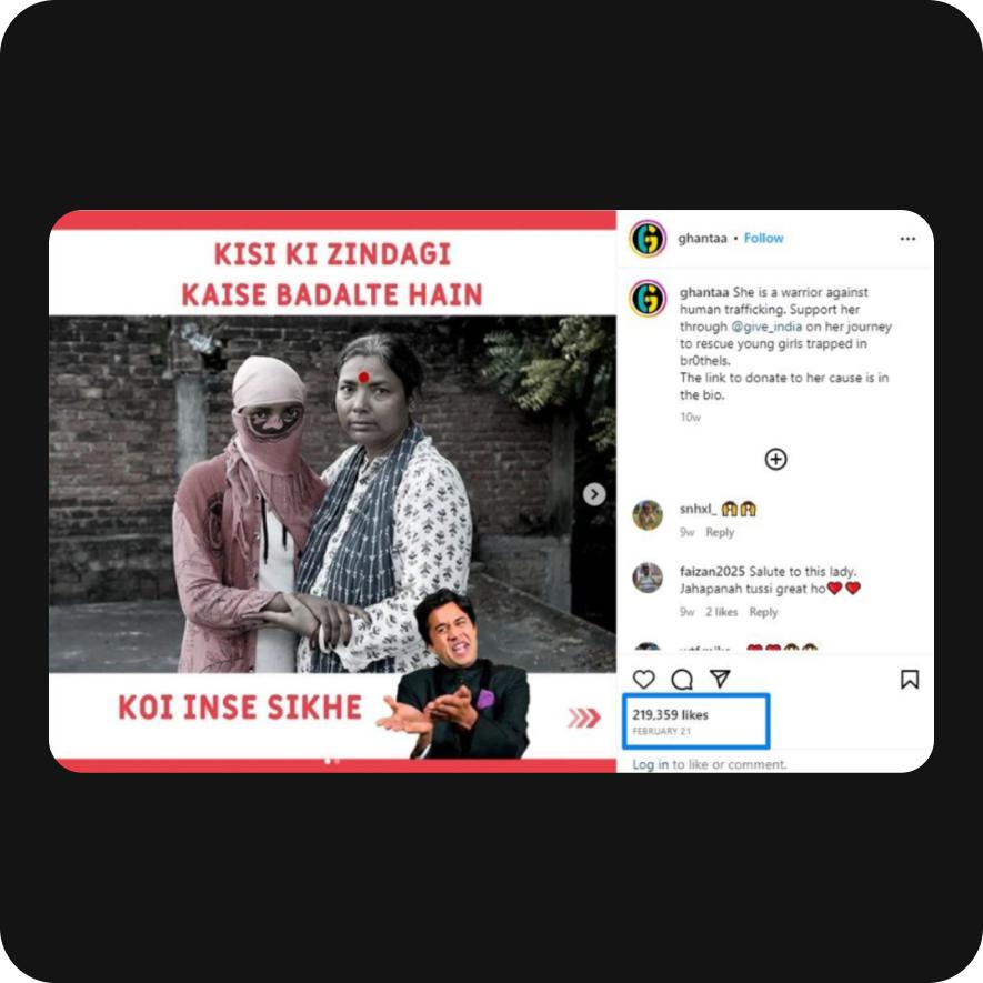 We crafted a comprehensive plan that included carousel posts featuring Manju, a resilient worker from "The Gudiya Foundation," who had rescued over 5000 girls from brothels. The carousel posts seamlessly integrated static images, videos, and memes to captivate and retain audience attention.
